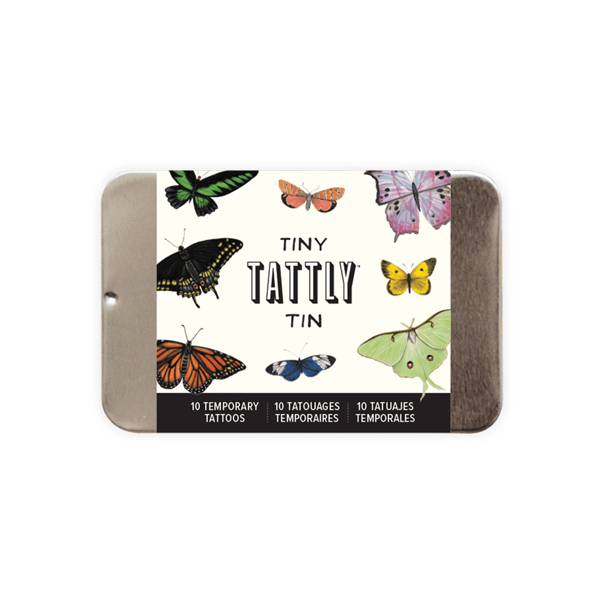 Tiny Butterfly Tin by artist Kelsey Oseid. Quality, non-toxic and made in the USA. Fake tattoos by real artists! Tattly Tiny Tins are the cutest way to tote around your Tattly! Each contains 10 Tattly and a mini sponge, packaged in a reusable slide-top tin with paper belly band. Tin size: 3.6"x2.4"x0.5".